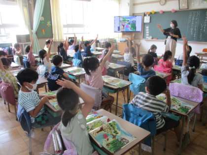 教科書の挿絵の中には、有名な昔話がたくさん載っています。「桃太郎」「かぐや姫」「さるかに合戦」等、子供たちは次々と見付けていった様子です。みんなが物知りなので、先生も感心していらっしゃいました。