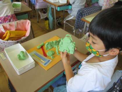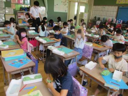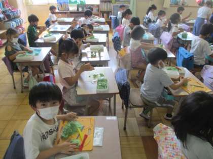 楽しく粘土を使った造形活動に取り組む1年生です。自慢の作品、自信作のオンパレードらしく、「見てください」リクエストに応じきれぬ程のアピール数に驚きました。ケーキ、深海のカニ、パイナップルなど、ジャンルは多様でしたよ。
