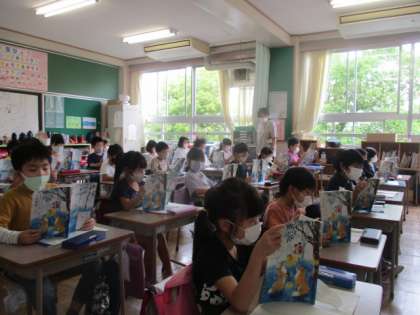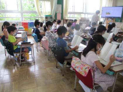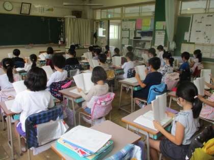 教室に入った瞬間、子供たちのよい姿勢が大きなインパクトを与えます。素晴らしいですね。国語の音読をしていた2年生です。おかげで、音声表現のグレードも2割増といったところでしょうか。