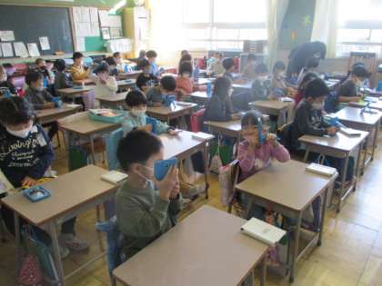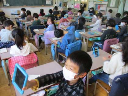 一人一人が手渡された鏡を自由に扱って、色々な気付きを得ています。「〇〇をする」と指定されていない活動を通して、1年生なりに得た様々な発見を、ねらいとする学習へとつなげていきます。