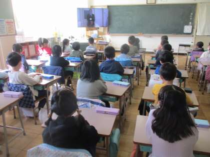 画像は、6年4組(上)、もうすぐ2年生に進級する1年生(中)の様子です。