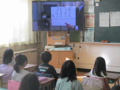 暗算の表彰が行われました。校長先生から出された、4桁×4桁の問題を瞬時にして解き、見ていた子供たちからは感嘆の声があがっていました。