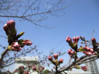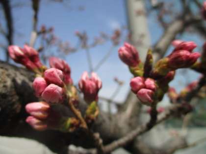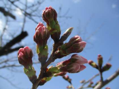 まだか、まだかと、桜の様子が気になって仕方がない春の陽気です。南門脇の木は、今にも花が開きそうな昼下がりです。