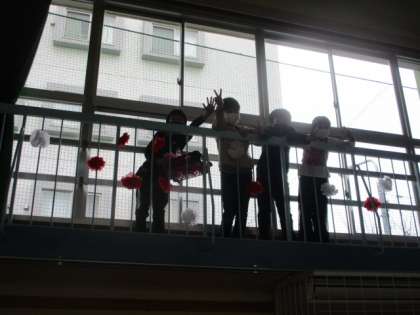 式には参列できないものの、4年生が6年生の卒業をお祝いする気持ちは一緒です。そんな思いをお花にこめて、会場のギャラリーを飾り付けてくれていました。