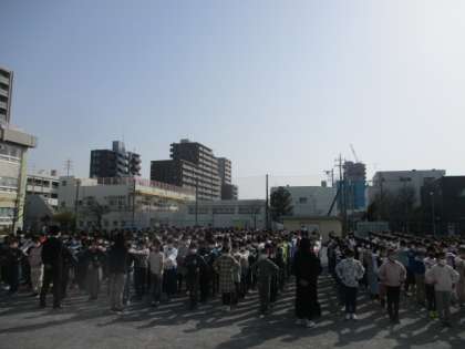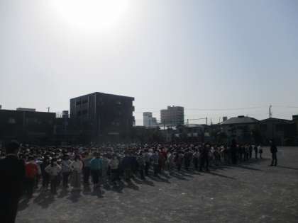 卒業してしまった6年生の姿はなく、1〜5年生が校庭に集合しました。それでも600名を超える児童数、大規模校に変わりなしです。そんな大人数が集まっても、決してザワつくことなく落ち着いているのが、本校の力です。素晴らしい!
