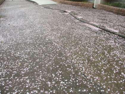 雨上がりの朝、薄ピンクの花びらが散り敷いています。
