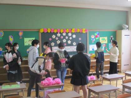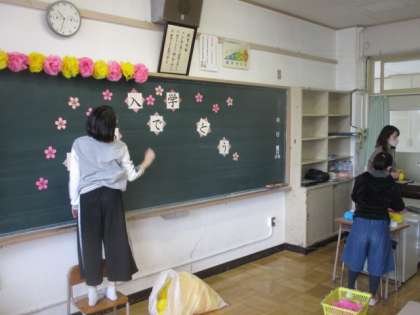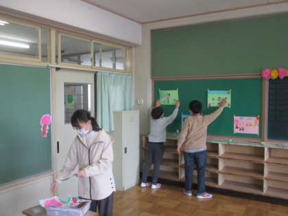 闇雲に絵を貼るのではなく、友達と高さや位置を確認し合いながら、丁寧に掲示している少年二名に、担当の先生も感心したご様子でしたよ。