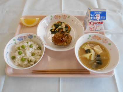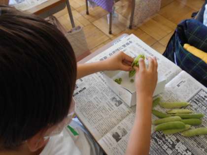 1年生がグリンピースのさやむきに挑戦しました。目・手・耳・鼻を使って、いろいろな発見をしていました。給食時間は美味しい!おかわりをする!と笑顔でよく食べていました。