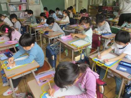 5/12 観察カードの書き方 公開日 2022/05/12 更新日 2022/05/12 学校日記 種まきをしたアサガオの生長具合を継続観察してきます。1年生はそれを記録するカードについて教わっていました。