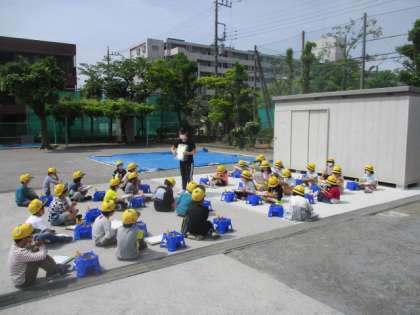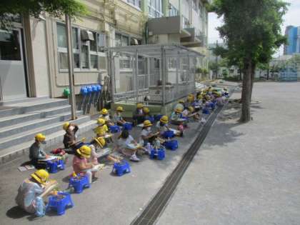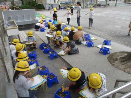 校庭へ出て、一人一鉢のアサガオとご対面です。芽が出て、双葉も出現していました。