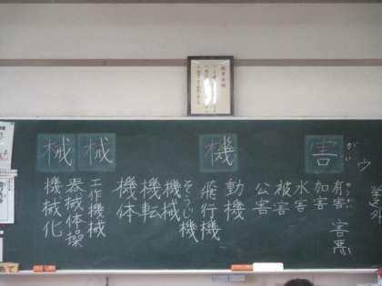 4年生は「機」「械」「害」の3文字を学習したようです。それが板書に残っていました。「工作機械」の「きかい」は「機械」、「器械体操」の「きかい」は「器械」と表記する点も、おさえられています。