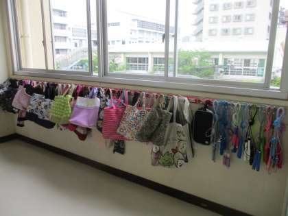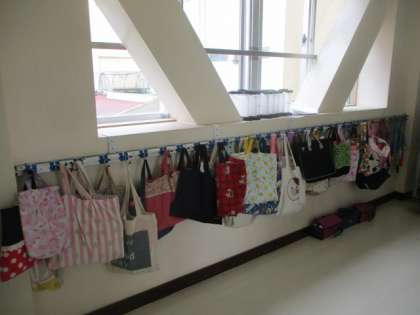 フックに掛けたい物は大量にあります。それだけにきちんと掛けていないと、落ちてしまったり、友達の物とごちゃ混ぜになったり、すごいことになりがち。こんな風に整然としていれば、その心配はなさそうですね。