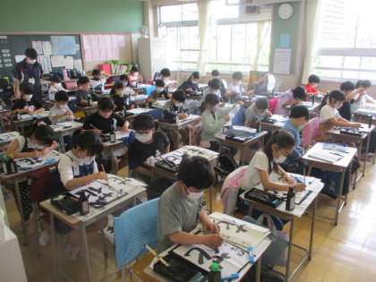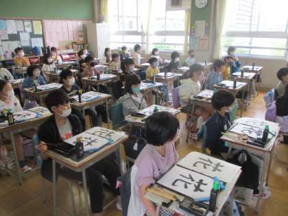 こちらは、書道に取り組んでいた2つのクラスです。本日のお題は「花」一文字。