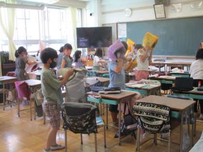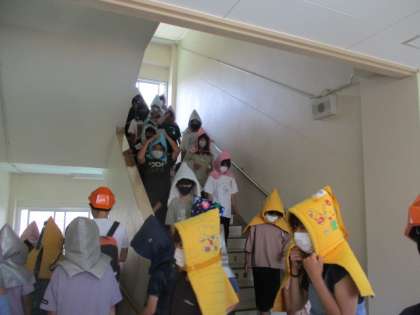 予想された強い揺れが収まり、素早く防災頭巾を身に付け、二次避難へ臨みます。