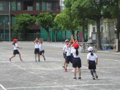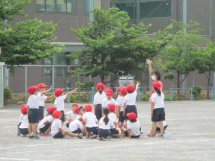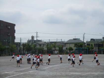 体育で鬼遊び、今日はバナナ鬼です。鬼をやりたがる子が結構たくさんおり、ジャンケンで勝ち抜き、その座を手にしただけでも、1年生は大喜びなのです。