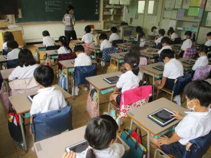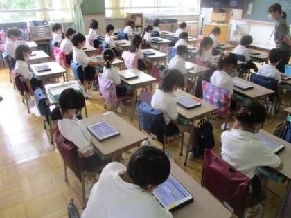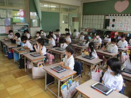 タブレットを操作している1年生が、嬉しそうに声をあげました。先生からのプレゼントが、一人一人に届いたようです。詳しくは、おうちで聞いてあげてください。
