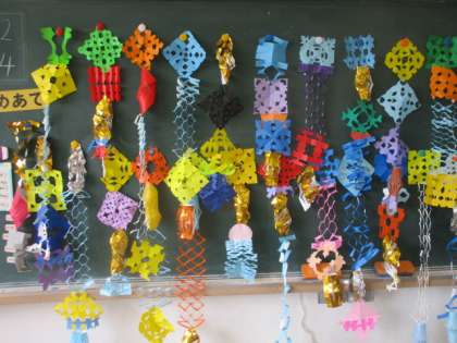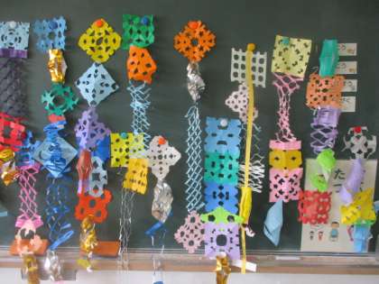 既に黒板が飾られています、「チョッキンパでかざろう」の作品で。1年生の教室が華やかに、彩られていました。