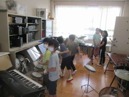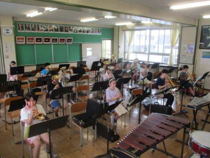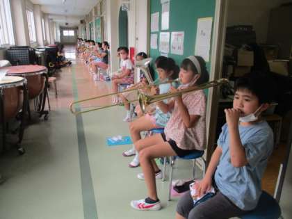 金管バンドの朝練習が続いています。4年生から6年生のメンバー大人数を前に、指導者も大奮闘です! 児童も、教員も、一人一人が頑張っている朝です。
