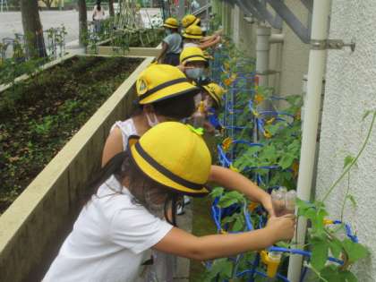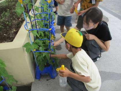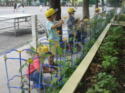 中休みの遊びより、水やりを優先している1年生です。茎が支柱をかなり這い上がっています。