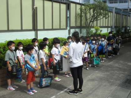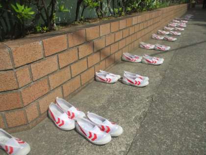 昨日とはまた別のクラスが、プール指導を行っている1年生です。上履きをきちんと揃え、心を落ち着かせて活動に臨みます。最下級性が示す手本、たいしたものです!