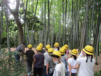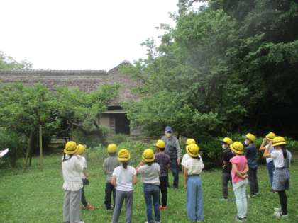 名主屋敷に到着しました。堀を渡り、季節風から屋敷を守る高い木々を見上げ、竹林を歩きます。