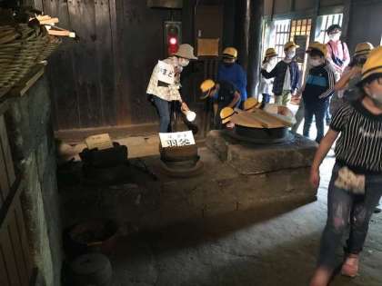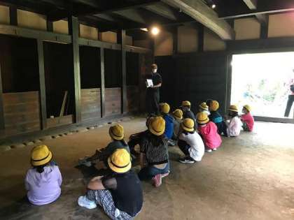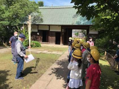 一之江名主屋敷を見学しています。藁葺き屋根のことについて教えてもらいました。また屋敷の中の様子についても説明してくださいました。