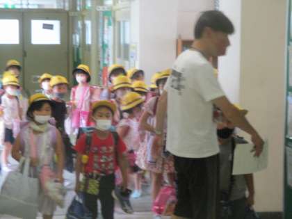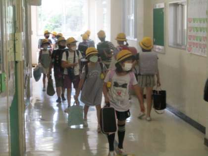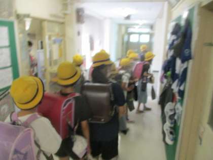 台風接近を想定した、学年別・色別の一斉下校を行いました。「絶対にしゃべらない」を最大の目標に据えて、臨ませました。