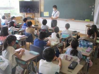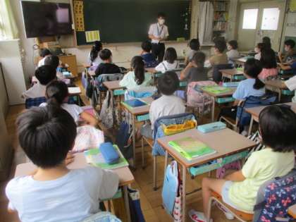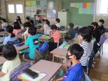 3校時の理科授業が今、始まったばかり。4年生は先生のお話を静聴できていますね。「うるさい!」「おしゃべりをやめなさい」なーんて注意は、全く必要ありません。素晴らしい!
