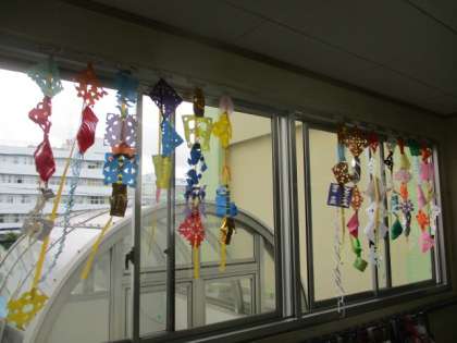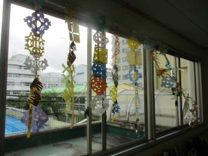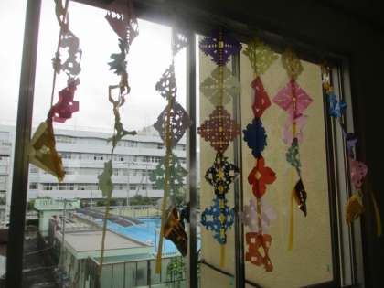 窓から吹き込む風に「かざりのカーテン」が揺れている、1年生教室前の廊下です。