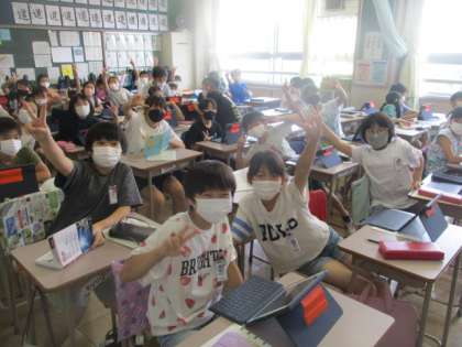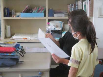 受け取る子以外のみんなは、課題をやって待っています。でも、どうやら写真に写る余裕は、十分すぎる程ある模様。(中画像)