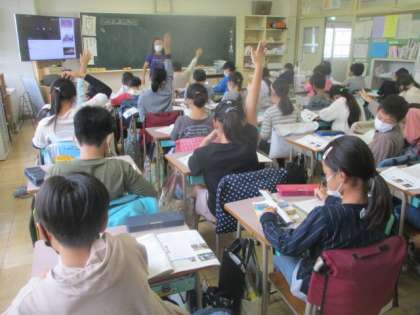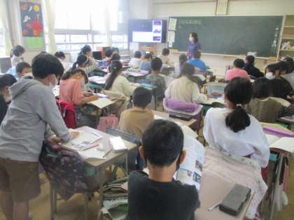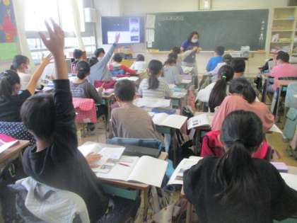 2校時の4年生です。社会科でくらやみ祭りを勉強しています。知識としてだけでなく、行事に込められた人々の願いに共感していかれると理想的。社会科の学習における大切なねらいの一つです。