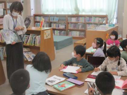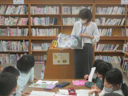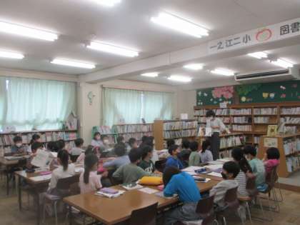 学校図書館で先生の読み聞かせに耳を傾けていたのは、2年生のお友達です。いつもお世話になっている、いち・にの・くれよんさん以外にも、先生やご家族等、様々な方々からお話を聞かせてもらえるのは、とても幸せなことですね。