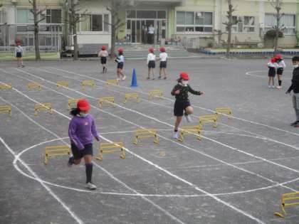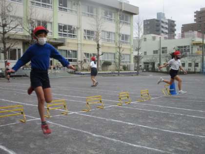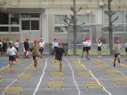 風はないものの、日ざしはなく、しんしんと冷えています。けれども、子供たちはいきいきと運動中! 3年生の小型ハードル走です。