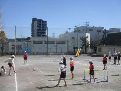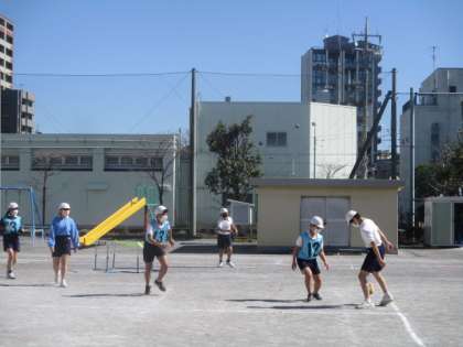 6年生の2クラスが、活発にゴール型ゲームに興じていました。