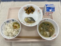 ごはん 白菜の浅漬けさわらのゆずみそ焼きかぼちゃと大豆とじゃこの揚げ煮けんちん汁...
