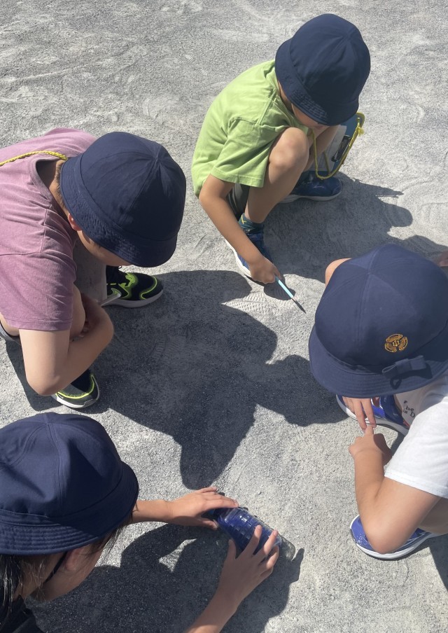 本日の授業では、校庭の地面のどこがどれくらい傾いているのかを、色水が入ったペットボトルで調べました。傾きがない場所、傾きが大きい場所などを見付けることができました。