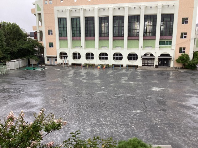 「校庭は真ん中より端の方が低くなっていて、端に水が流れて溜まっているのではないか」と予想しました。