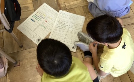 1年生の国語では、『うみのかくれんぼ』の学習をしています。海の生き物たちがどのように隠れでいるのかを、色分けをしながら読み取っています。友達同士で教え合いながら、楽しく取り組んでいます。