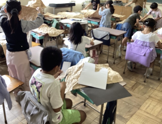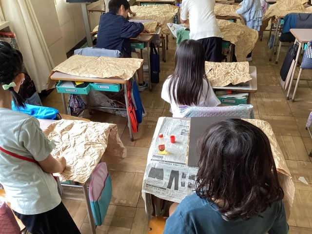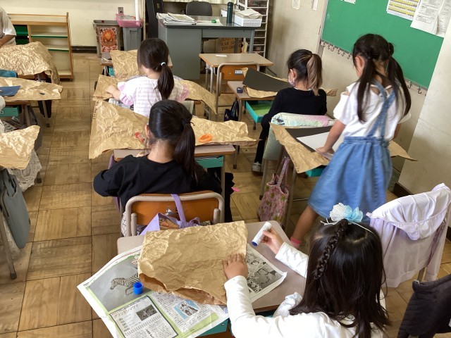 2年生の図工ではクラフト紙を使って、「お友だち」を作り始めま子供たちはクラフト紙をのりで貼り付ける作業がむずかしいようで、試行錯誤しながら一生懸命取り組んでいました。