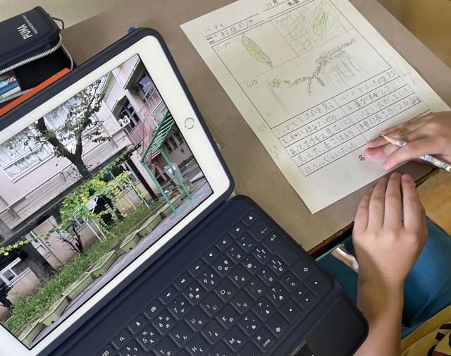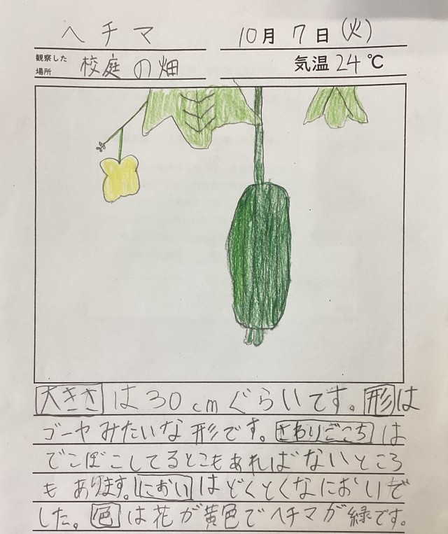 5月に子供たちが種を植えたヘチマがぐんぐん育ち、立派な実がなりました。触ったり、においをかいだり、目でじっくり見たりしたことを、観察カードに一人一人まとめました。ヘチマの実が想像以上に大きいことに驚いていました。