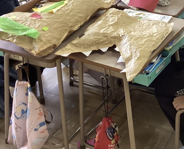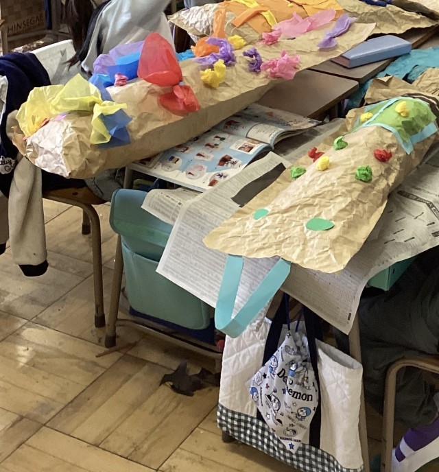 今日は完成した作品を友達と見せ合いました。カラフルなお花紙や画用紙を使って作品を作り、自分なりに工夫したポイントを披露しました。お気に入りの「お友だち」を笑顔で楽しそうに紹介している姿が印象的でした。