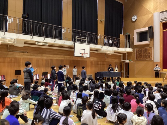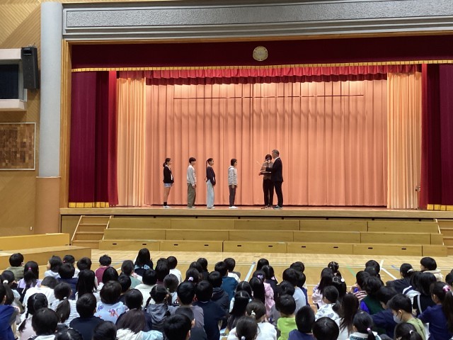 今日は朝会がありました。今週末に迫った学習発表会に関する話や、区の体育大会、歯と口のポスター、科学コンテストの表彰が行われました。