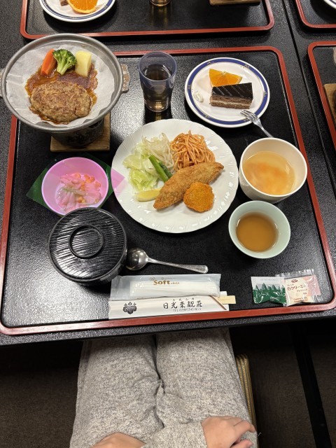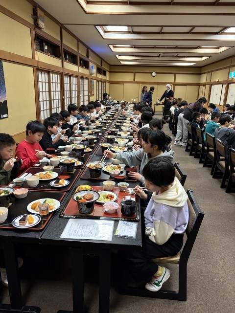 2日目の夕食はハンバーグ、白身魚のフライなどでした。美味しくいただき、この後、ふくべ細工づくりに挑戦します。