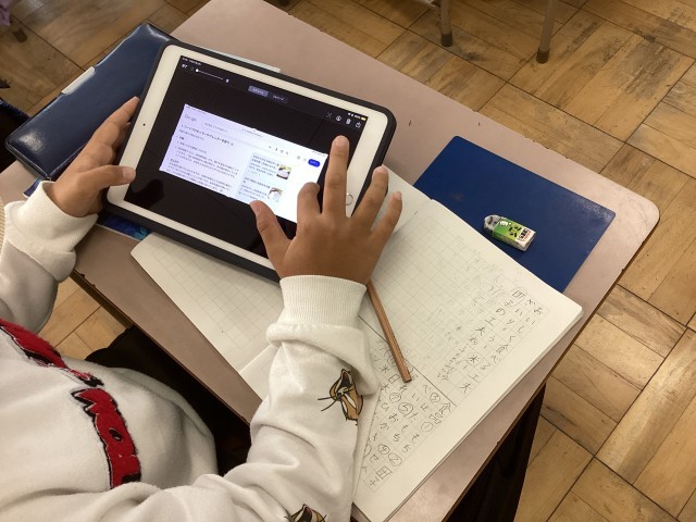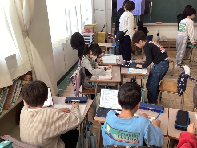 3年生の国語では「すがたをかえる大豆」のまとめをしています。自分たちで「すがたをかえる卵」や「すがたをかえる米」とテーマを決め、調べてまとめています。興味をもちながら、楽しそうに学習をしています。