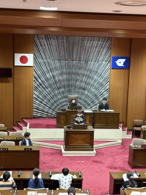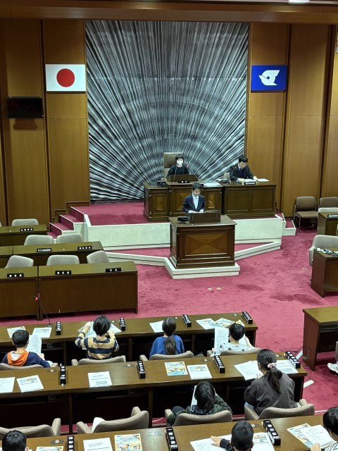 5年生は江戸川区議会に見学に来ました。議会の仕組を学び、実際に議場の席に座りました。区長、議長、議員役を出し、本会議体験もさせていただきました。