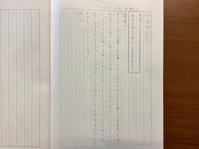 この日は初めて読んでみた感想をノートにまとめました。やなせたかしさんの人生を辿って、感じたことを表現することができました。
