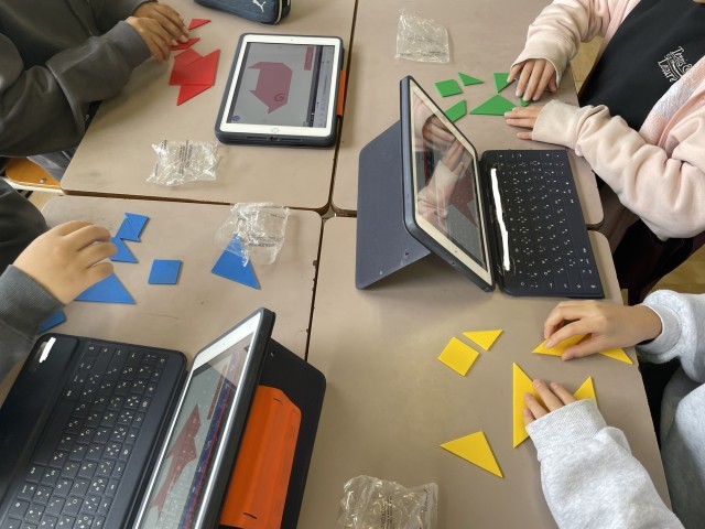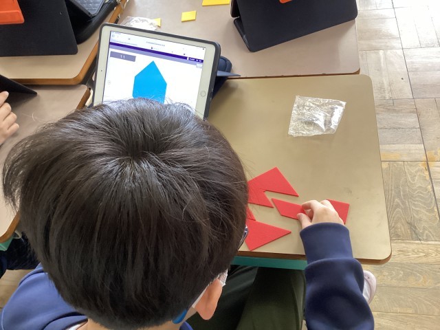 パターンブロックを使って、指定された形を作る活動にチャレンジしました。子供たちは試行錯誤しながら、じっくり思考したり、友達と考えを共有したりして、粘り強く取り組みました。
