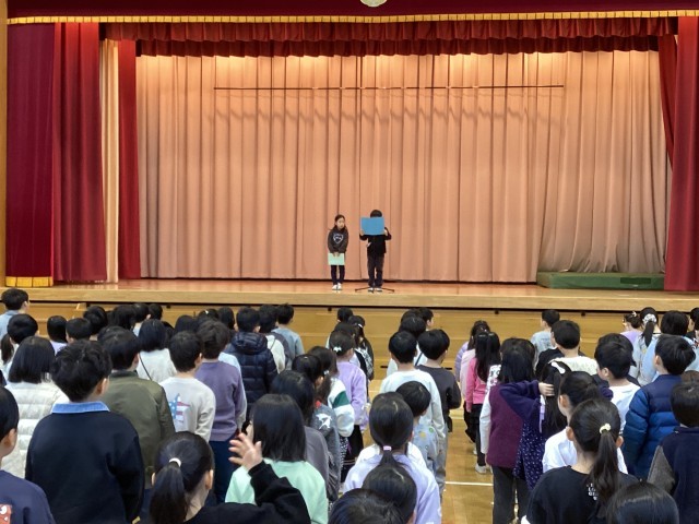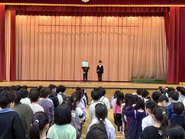 今日から3学期が始まりました。校長先生から、「馬が合う」という慣用句を例に、友達との関わり方についてのお話がありました。また、2年生の代表児童が3学期のめあてを発表しました。漢字の学習を頑張りたい・1年生のお手本となるように、挨拶をしていきたいと、新学期らしい前向きな目標を立てていました。