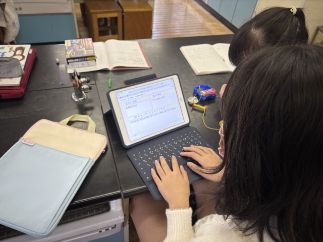 この日は、電磁石の極の向きが変わるのには何が関係しているのかを調べました。予想したことを確かめるために、変える条件と変えない条件を明確にして実験しました。友達と助け合いながら取り組むことができました。