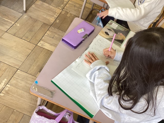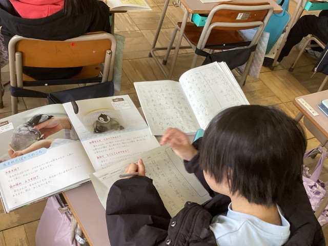 「動物の赤ちゃん」の学習のまとめとして、自分が気になる動物について本で調べました。生まれた時の大きさや、エサの取り方など本をじっくり読み、プリントにまとめます。友達が調べた動物と比べると、違いが見つかり驚いていました。